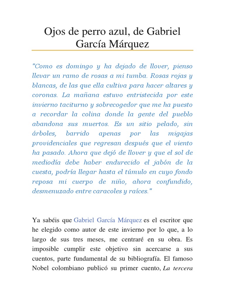 Especial Preguntas Y Respuestas De Historia Codigo De Honor Libros Libros Gratis from i.pinimg.com Ojos de perro azul registra las primeras prácticas de vuelo del autor de el coronel no tiene quien le escriba. En qué cuento los sueños conforman la única realidad que tienen dos amantes? Ojos de perro azul en estas once novelas escritas en 1947 y 1955, el dominio del joven garcía márquez ya es sorprendente rico en imágenes, pero nunca cae en la trampa del realismo mágico, entonces tan de moda en américa del sur.
