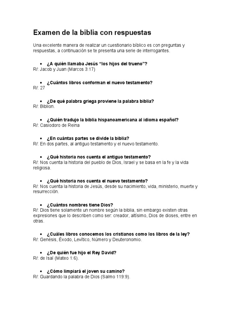 Examen De La Biblia Con Respuestas Docx Biblia Viejo Testamento from imgv2-1-f.scribdassets.com Cuestionario mundial pregunta las por la primera guerra mundial se estiman la magnitud de las deudas llevadas cabo desde el sigloxvi en todas las guerras falso. Porque es percibida por la vista 23. Последние твиты от preguntas & respuestas biblicas (@mcnoticias).