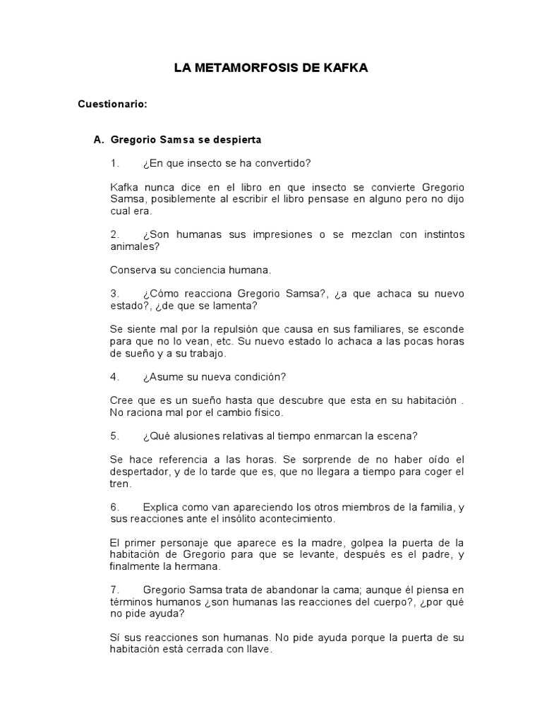 La Metamorfosis Preguntas Y Respuestas. Necesito saber preguntas & respuestas sobre la obra frank kaska la metamorfosis. La metamorfosis guía de estudio contiene una biografía de franz kafka, ensayos literarios, cuestionarios, temas principales, personajes y un resumen y.