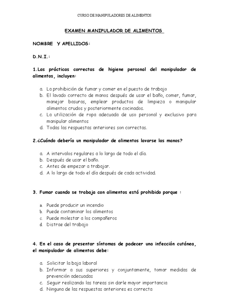 Todas las preguntas tienen solo una respuesta correcta (marca la que consideres. ¿quieres realizar el curso de manipulador de alimentos y tienes preguntas? Realice el examen de las preguntas del manual. El manipulador de alimentos de mayor riesgo es el que ejerce sus actividades en los establecimientos del sector de las comidas preparadas 4.