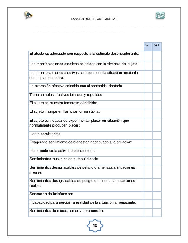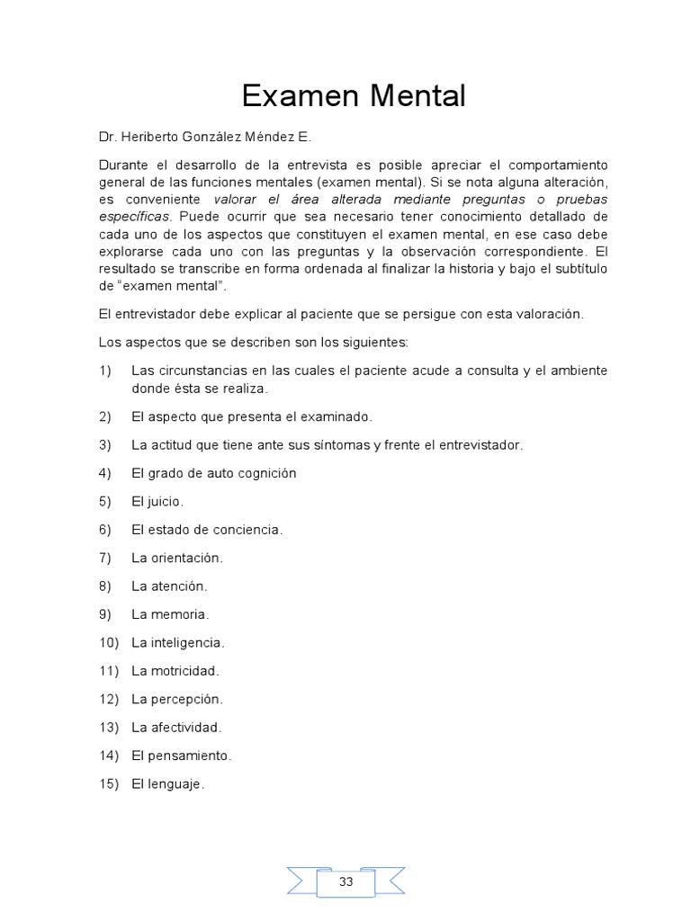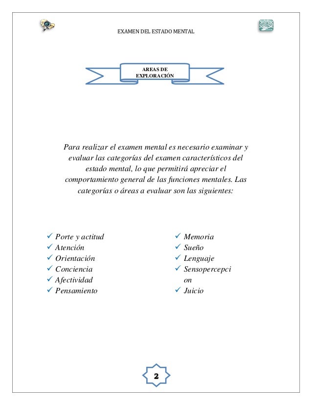 Un examen mental básico debe contener los siguientes elementos: Esta introducción al examen de las una manera de abordarlos es preguntarle si ha tenido recientemente alguna preocupación y si logamos entrar en confianza con el paciente. We are a sharing community. Los componentes de este examen son temas de: