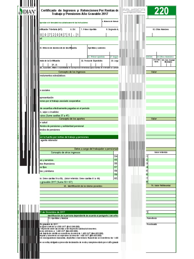 Para su diligenciamiento es importante consultar las hojas datos iniciales, ingresos, aportes y retenciones de este archivo de excel, en las cuales se ingresará la información de. Este certificado de ingresos y retenciones solo debe expedirse a las personas naturales asalariadas, según la información que está contenida en el formulario 220. 220 certificado de ingresos y retenciones por rentas de trabajo y de pensiones año gravable 2019 4. Mi patrimonio bruto era igual o inferior a 4.500 uvt ($149.202.000).