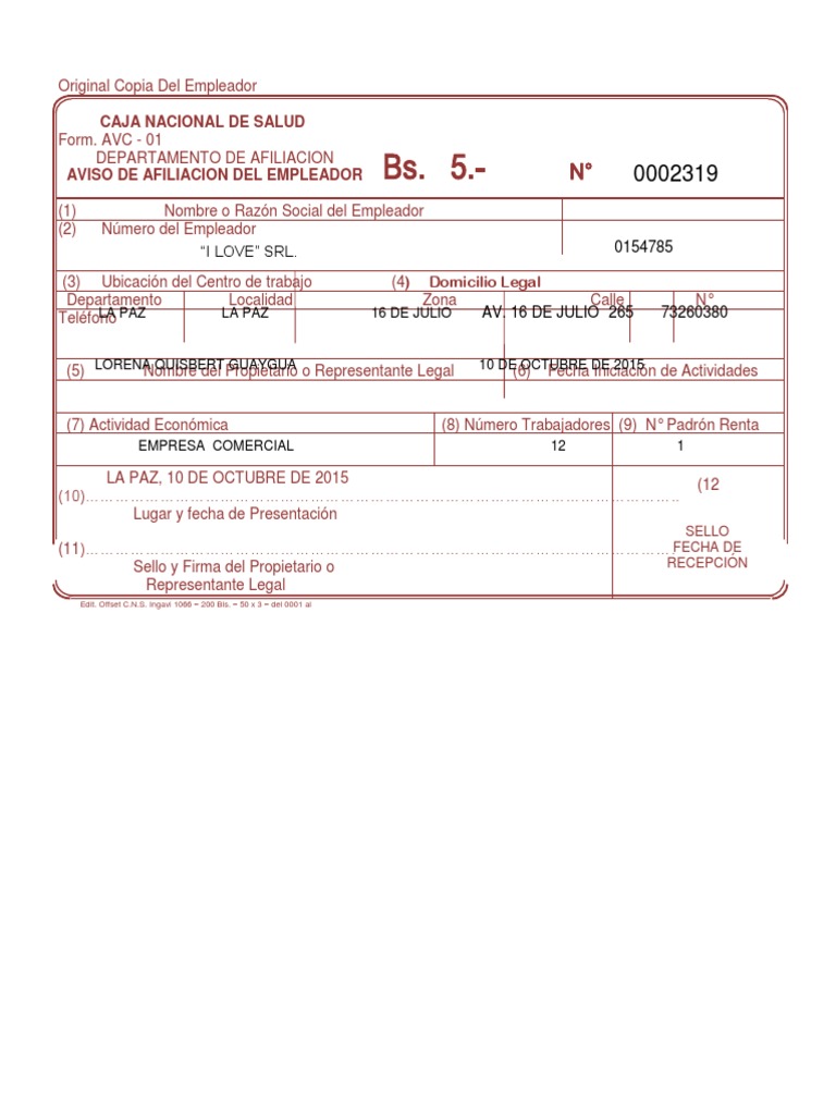 Formulario Avc 01 Edwin from imgv2-1-f.scribdassets.com Afiliacin de empleador a la caja nacional de salud. Para el trmite de cualquier empresa los tres formularios requeridos tienen un costo de bs. Certificado de nacimiento (computarizado) o bautismo del asegurado y los padres.