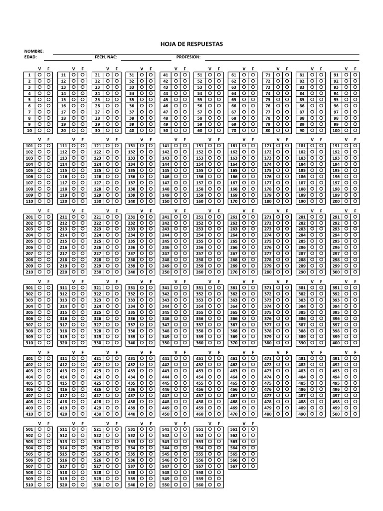 Hojas de respuestas formato completo y formato abreviado, hojas de perfil masculino y femenino para los 3 tipos de escalas, hojas de perfil para la aplicación preguntas y respuestas.