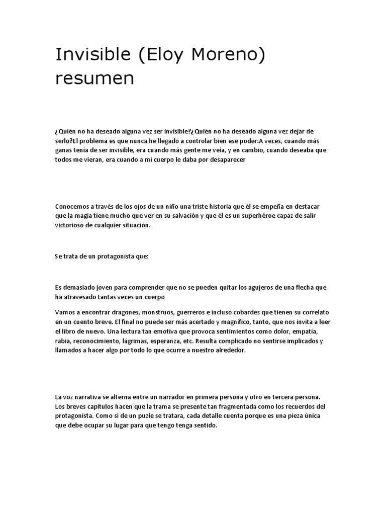 Resena Invisible De Eloy Moreno from 4.bp.blogspot.com Con una maleta y aquella historia que se había convertido en más que su novela, eloy moreno (castellón, 1976) decidió que tras dos años de romance era hora de sacar el bolígrafo de gel verde de ese lugar invisible en el que muchas veces se quedan miles de hojas con letras. Buenos días de jueves lluvioso, damos inicio al otoño y lo hacemos con ganas y con un libro especial que si le das una oportunidad te va a enamorar. El libro está narrado por un niño, anónimo durante toda la novela.