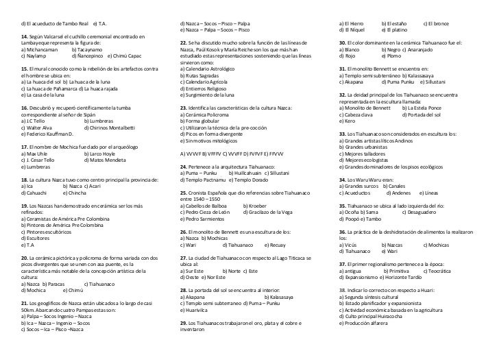 Test 2017, preguntas y respuestas - StuDocu from d20ohkaloyme4g.cloudfront.net Esta selección de preguntas y respuestas para ampliar conocimientos puede hacer que te pongas a prueba mientras aprendes sobre ciencia, historia 25. Banco de preguntas de historia del perú 5. Todo para descargar gratis en formato pdf, o imprimir en literatura infantil y juvenil.