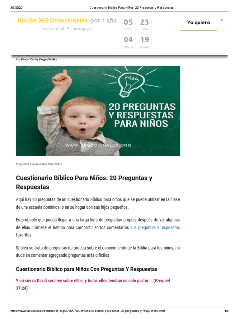 Preguntas y respuestas para niños cuestionarios bíblicos para niños con preguntas con sus respuestas aquí hay 20 preguntas de un cuestionario bíblico para niños que se puede utilizar en la clase de una escuela dominical o en su hogar con sus hijos pequeños. A continuación encontrarás 70 preguntas de cultura general basada en el temario que aprenden los niños de primaria, desde los 6 años hasta los 12. 25 preguntas absurdas y divertidas las preguntas capciosas son aquellas que se realizan con la intención de que el receptor se confunda. De 9 a 12 años) hoy en día, los niños pasan mucho tiempo frente a la televisión y las computadoras aún desconocen lo que está sucediendo en el mundo.