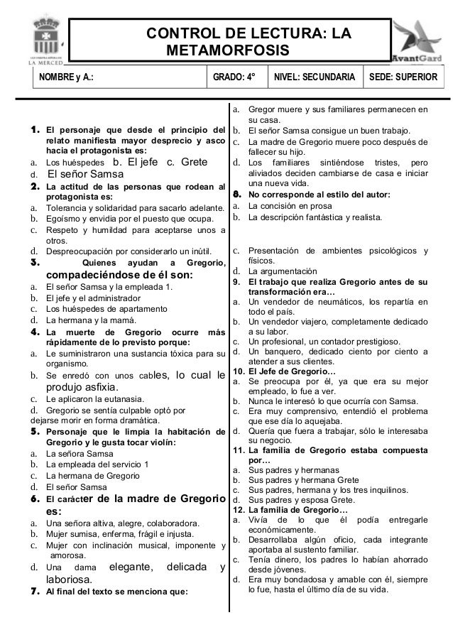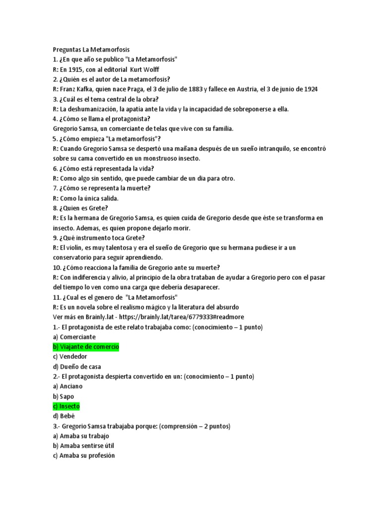 La Metamorfosis Preguntas Y Respuestas. En 1915, con al editorial kurt wolff 2. (conocimiento 1 punto) a) comerciante.